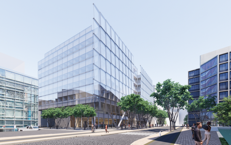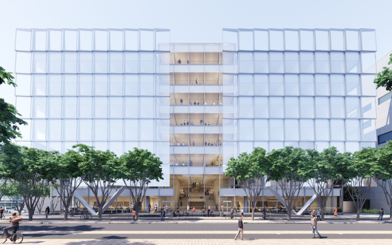 As seen in architectural renderings, the building’s transparent and outward-looking design will give passersby a direct view into the first two floors. These floors will offer multiple convening areas for the campus community and the public to come in and engage with the college, including a 250-seat lecture hall, a suite of student spaces for project-based work and tutoring, a café, and a variety of seating options for studying and social interactions.
